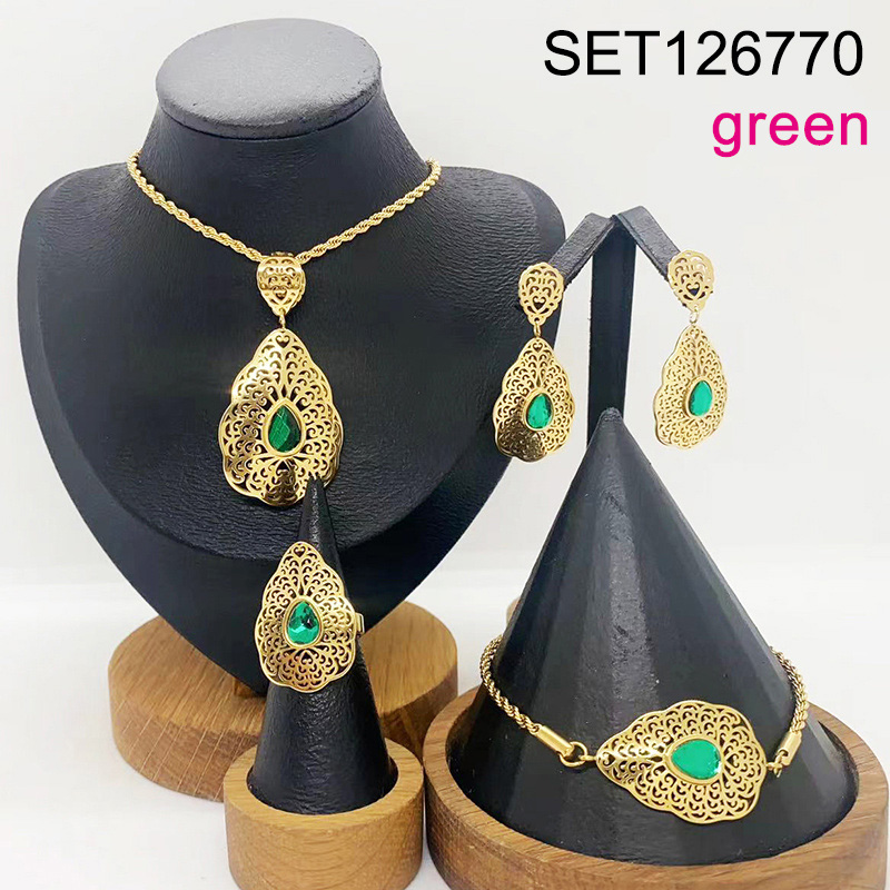 Level B Stainless Steel New Trendy Women Jewelry Green Stone Water Drip Golden 4pcs SET