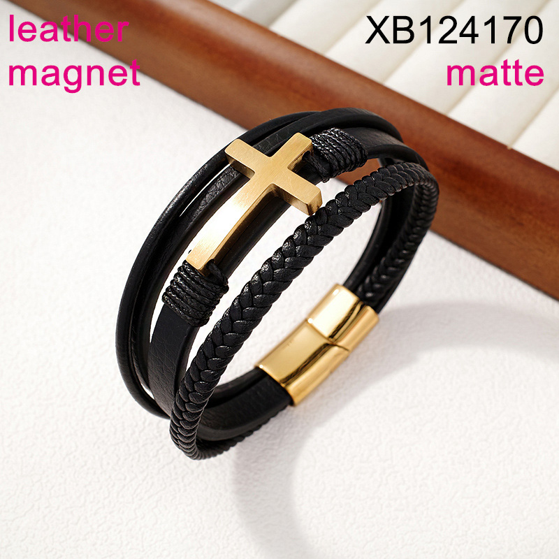 Home > Level B Stainless Steel New Trendy Man Jewelry Four Layer Chain Cross Golden Magnet buckle Leather Bracelet