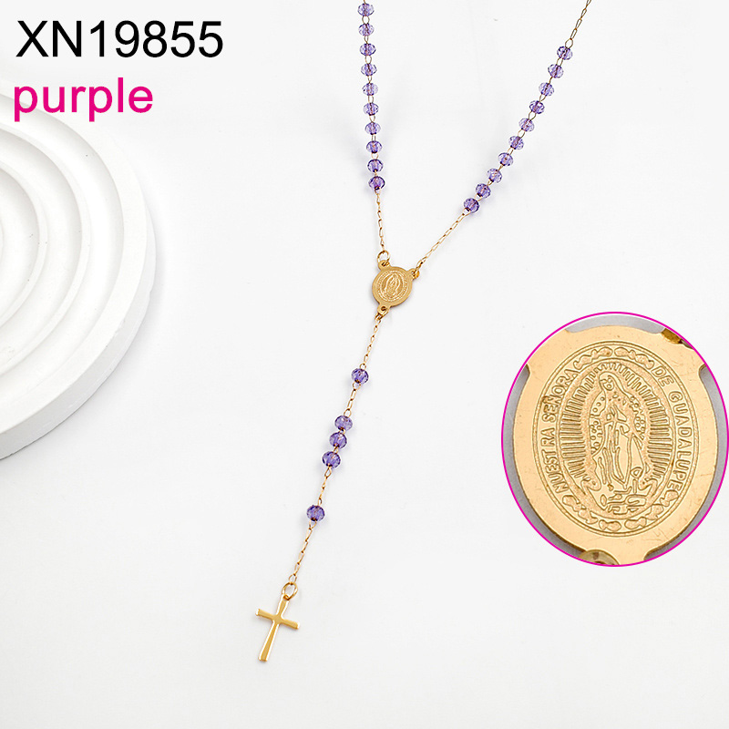 Level B Stainless Steel New Trendy Women Jewelry Purple Bead Chain Religion Cross Golden Necklace