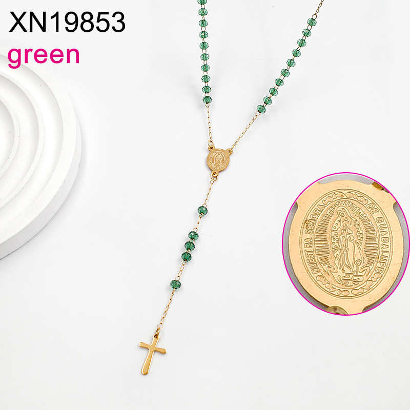 Level B Stainless Steel New Trendy Women Jewelry Green Bead Chain Religion Cross Golden Necklace