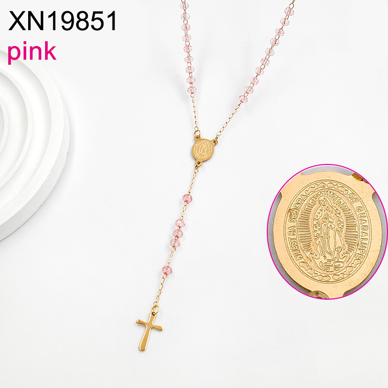 Level B Stainless Steel New Trendy Women Jewelry Pink Bead Chain Religion Cross Golden Necklace