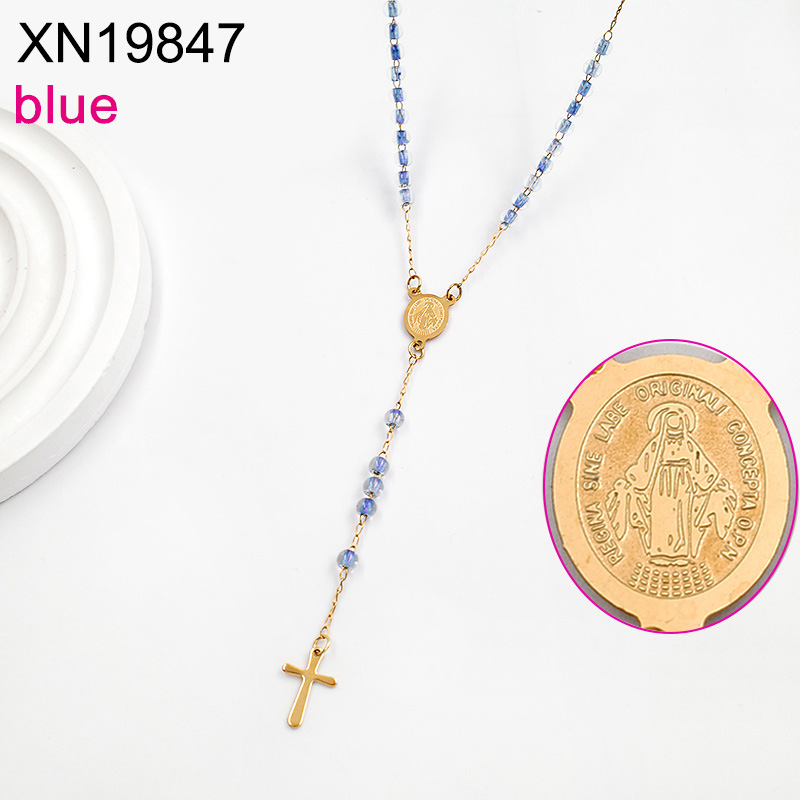 Home > Level B Stainless Steel New Trendy Women Jewelry Blue Bead Chain Religion Cross Golden Necklace