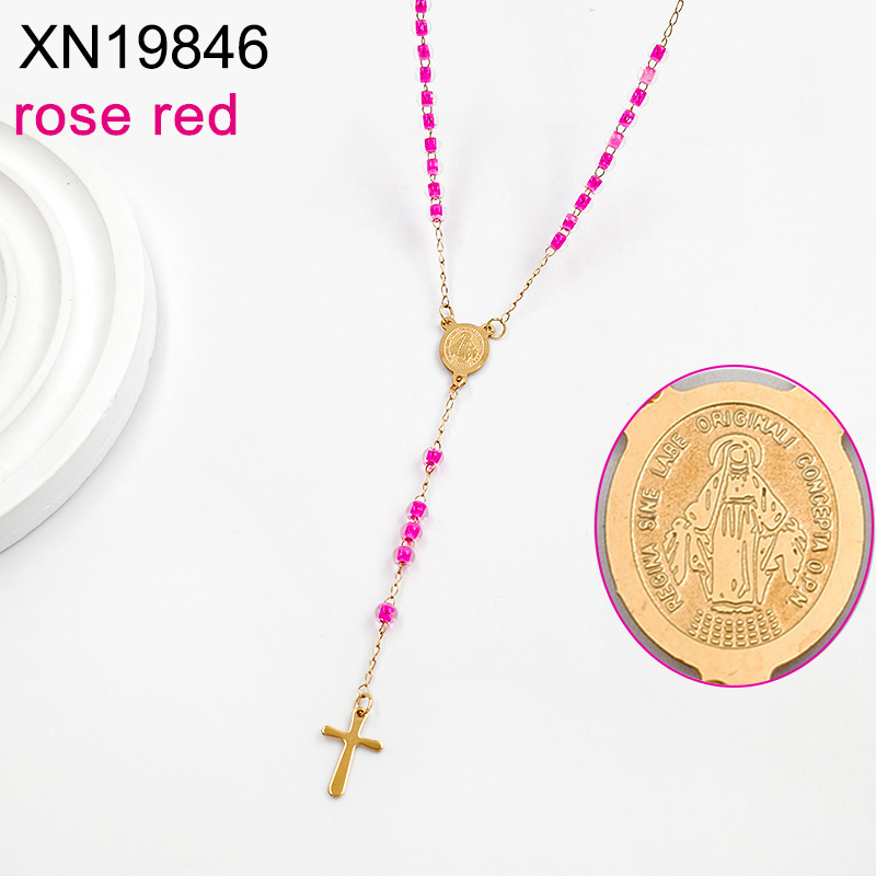 Level B Stainless Steel New Trendy Women Jewelry Rose red Bead Chain Religion Cross Golden Necklace