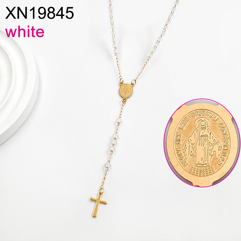 Level B Stainless Steel New Trendy Women Jewelry White Bead Chain Religion Cross Golden Necklace