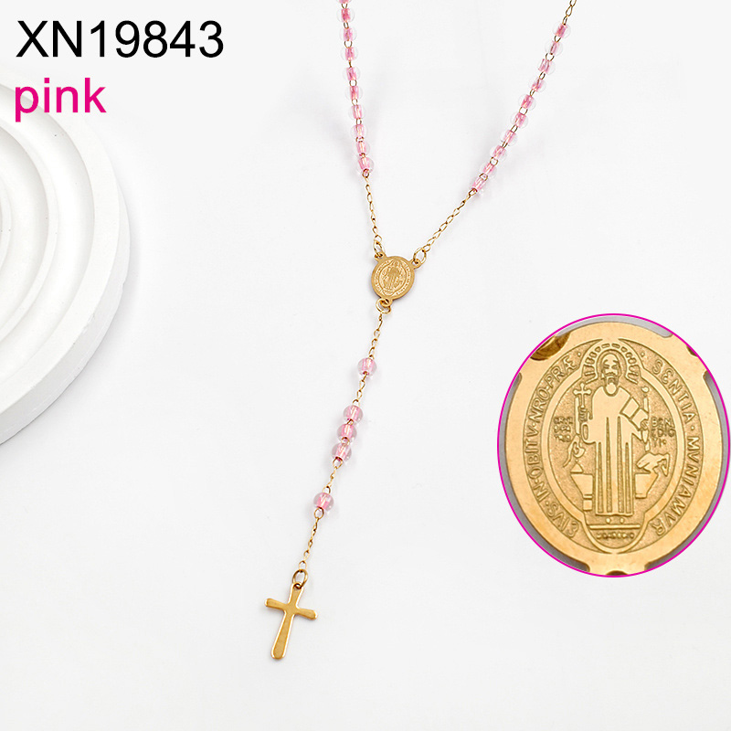 Level B Stainless Steel New Trendy Women Jewelry Pink Bead Chain Religion Cross Golden Necklace