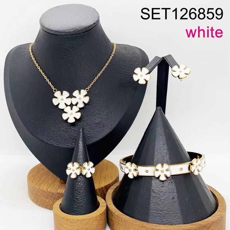 Level B Stainless Steel New Trendy Women Jewelry Drip Oil/Enamel White Flower Golden 4pcs SET