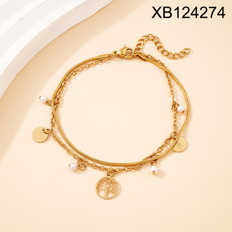 Level B Stainless Steel New Trendy Women Jewelry Two Layers Chain Tree Golden Bracelet