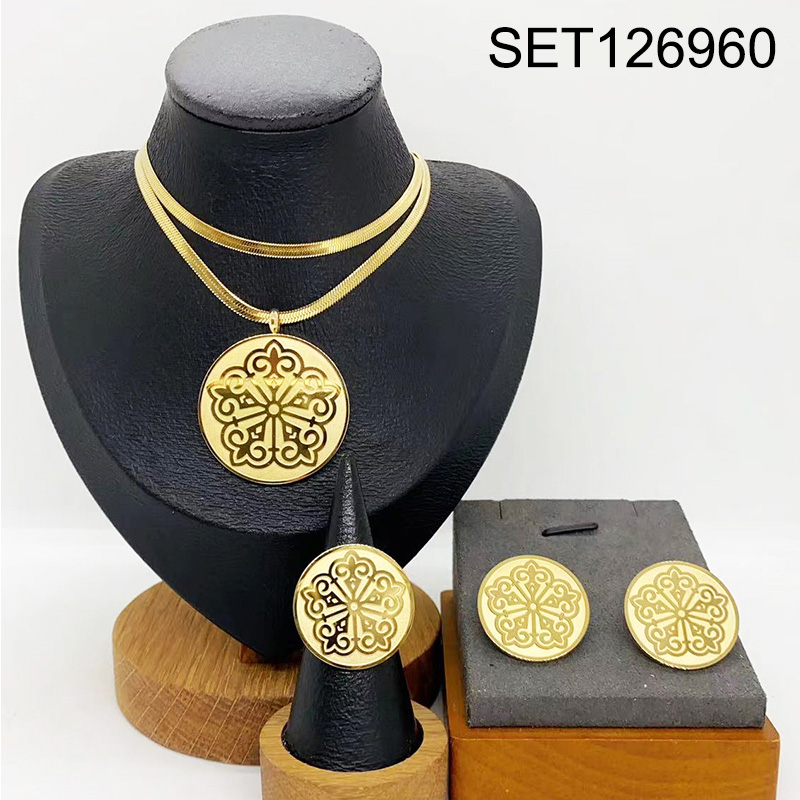 Level B Stainless Steel New Trendy Women Jewelry Two Layers Chain Round Flower Golden 3pcs SET