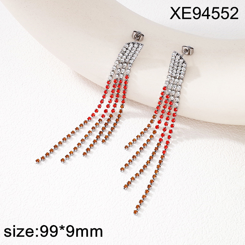Level B Stainless Steel New Trendy Women Jewelry Rhinestone Steel color Gradient Red Tennis Chain Four Rows Tassel Earrings