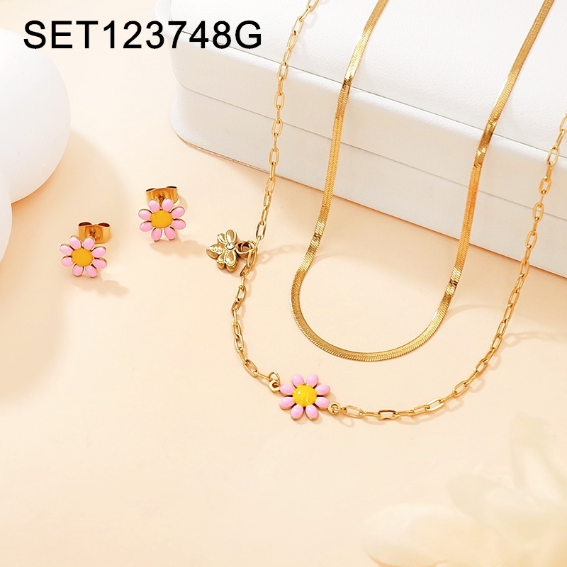 Home > Level A Stainless Steel New Trendy Women Jewelry Two Layers Chain Drip Oil/Enamel Flower Animal Bee Golden SET