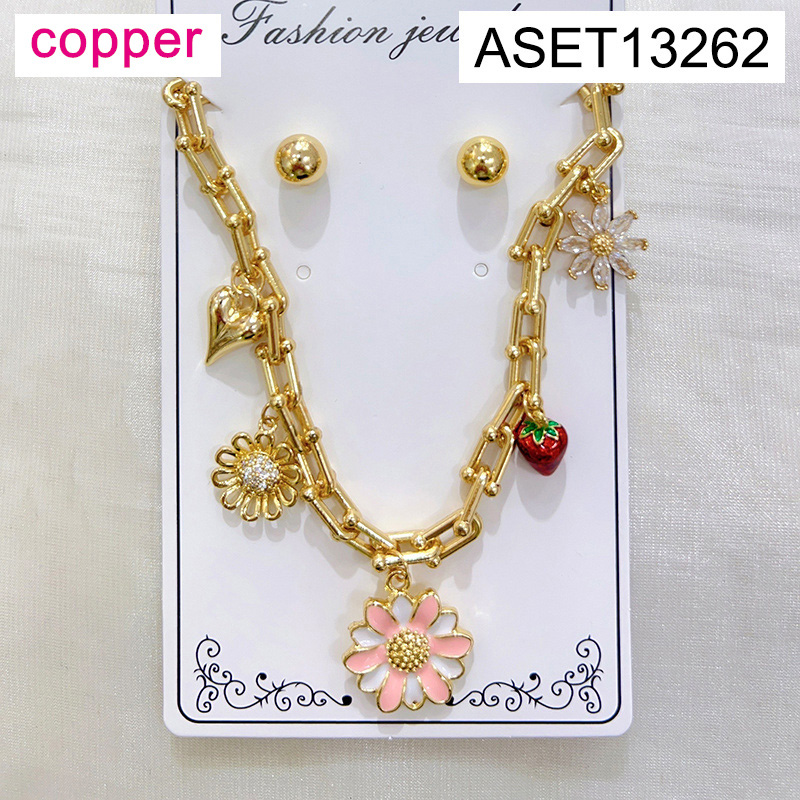 Level B Fashion Jewelry New Trendy Women Jewelry Horseshoe buckle chain Drip Oil/Enamel Summer fruit style Strawberry Flower Golden SET;Material:copper (cobre)