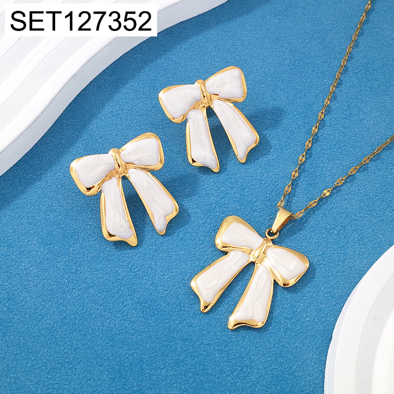 Home > Stainless Steel Sets > Epoxy Jewelry > Level C Stainless Steel New Trendy Women Jewelry Pearl Style/Plastic Beads Drip Oil/Enamel White Bowknot Golden SET
