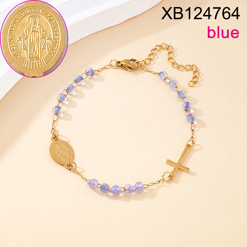 Home > Stainless Steel Bracelets > Level B Stainless Steel New Trendy Women Jewelry Blue Bead Chain Religion Cross Golden Bracelet