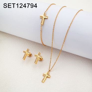 Home > Stainless Steel Sets > 3pcs Sets > Level A Stainless Steel New Trendy Women Jewelry Cross Golden 3pcs SET