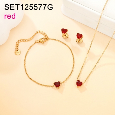 Home > Stainless Steel Sets > 3pcs Sets > Level A Stainless Steel New Trendy Women Jewelry Heart Red Glass Golden 3pcs SET