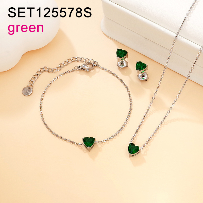 Level A Stainless Steel New Trendy Women Jewelry Heart Green Glass Steel color 3pcs SET