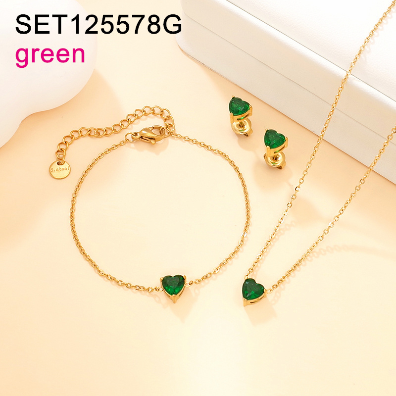 Level A Stainless Steel New Trendy Women Jewelry Heart Green Glass Golden 3pcs SET