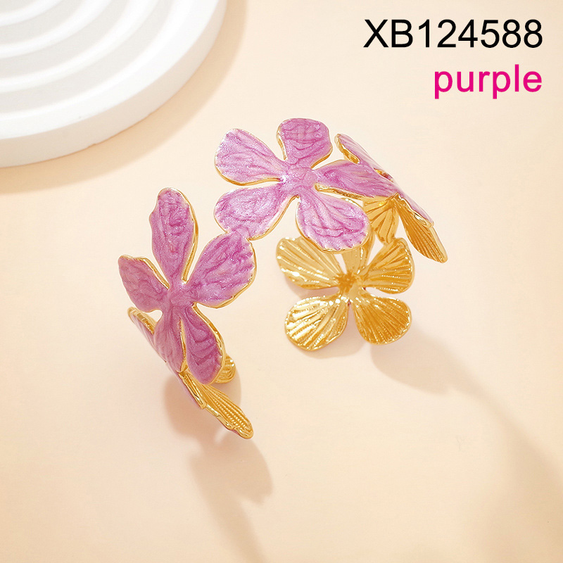 Level C Stainless Steel New Trendy Women Jewelry Drip Oil/Enamel Flower Golden Open Bangle;Bangle size can be adjusted freely