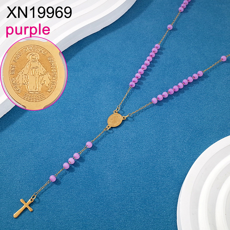 Home > Stainless Steel Necklaces > Level B Stainless Steel New Trendy Women Jewelry Purple Bead Chain Religion Cross Golden Necklace
