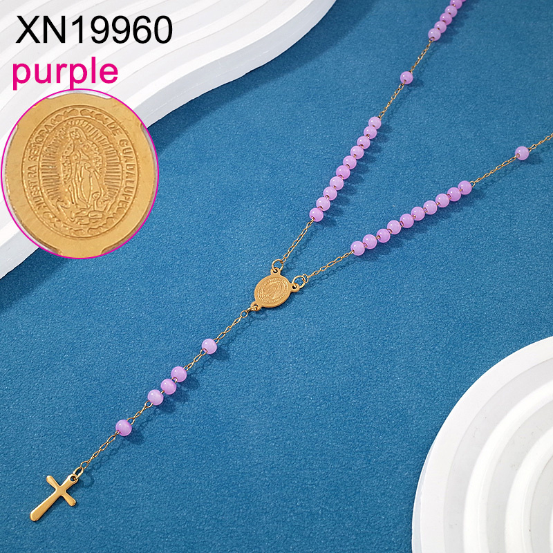 Home > Stainless Steel Necklaces > Level B Stainless Steel New Trendy Women Jewelry Purple Bead Chain Religion Cross Golden Necklace