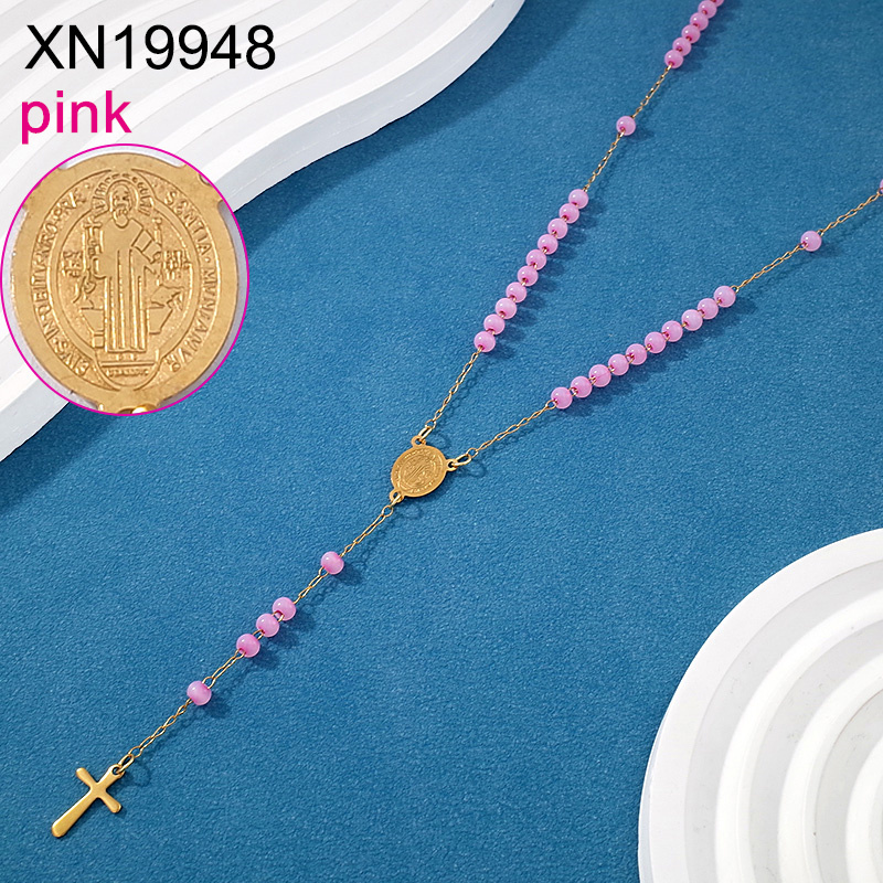 Level B Stainless Steel New Trendy Women Jewelry Pink Bead Chain Religion Cross Golden Necklace